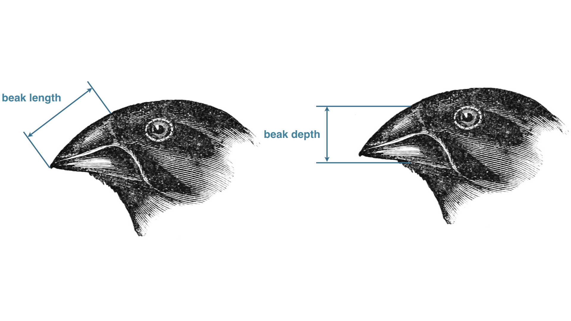 We will investigate their measurements of beak depth (the distance, top to bottom, of a closed beak) and beak length (base to tip on the top) of Darwin’s finches. The image below defines the beak length and beak depth.